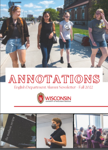 Annotations, the alumni newsletter of the University of Wisconsin-Madison English Department, keeps alumni connected to the department, and helps our alumni connect with each other. Published every fall, winter, and spring, Annotations reaches some 14,000 alumni around the world. We regularly feature profiles and articles on members of our exceptional alumni population, as well as stories about our faculty, our students, and the many things going on in and around the Department.
